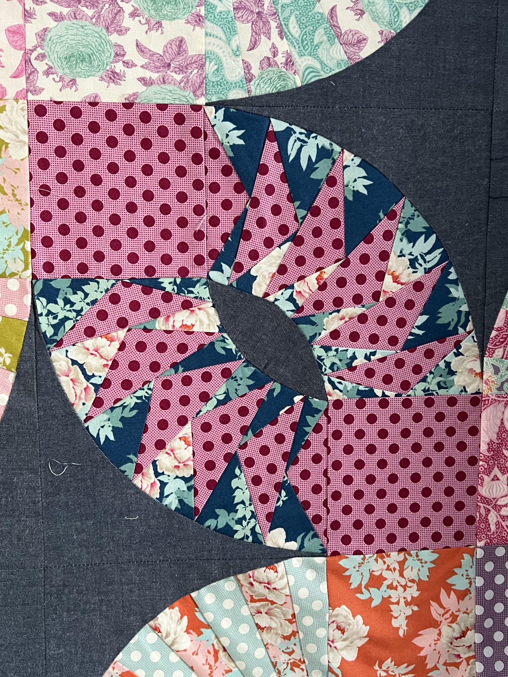 This quilt finishes to 56-inches square. Easily resized… just make more blocks. This pattern is printed 8.5 x 11″ and contains all printed materials to create three different foundation pieced centers for a curved piece block. Paper templates for foundation and curved pieces are included in the pattern. Teaches the basics of Foundation Piecing with more advanced choices. Also teaches the basics of Curved Piecing.